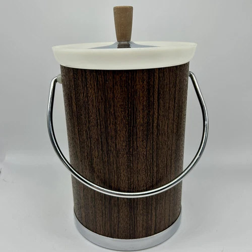 Vtg Kromex Ice Bucket & Lid Retro Faux Wood Grain Chrome Finish MCM USA Atomic