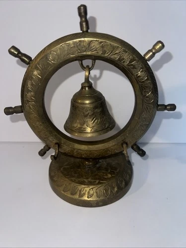Vintage Brass Nautical Ship's Helm Steering Wheel Bell Stand No Mallett