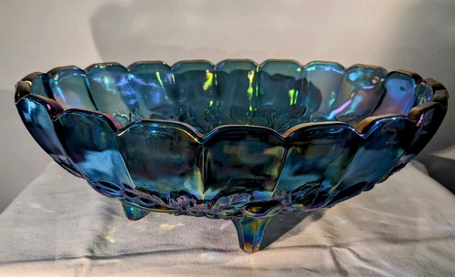 Vintage Indiana Glass Blue Carnival Glass Harvest Grape Footed Oval Fruit Bowl