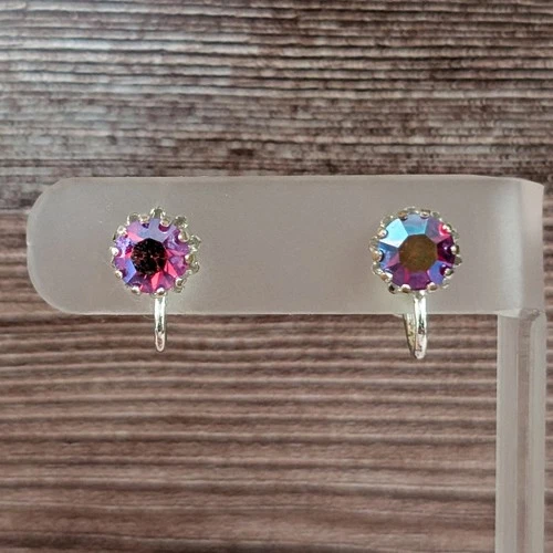 Vintage Screw On Earrings Iridescent Dark Pink Gems - Fair Condition