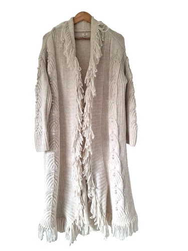 River Island Womens Cream Long Length Cardigan Pearl Sequins Tassels Size Medium