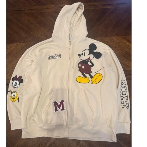 Disney Mickey Mouse 1928 Zip Up Hoodie Ivory Graphic Print Cartoon Size XL |J1