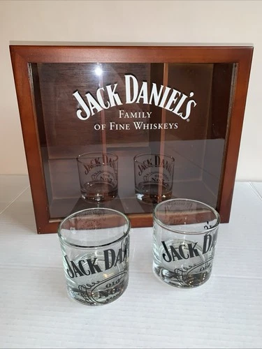 Jack Daniels Family of Fine Whiskeys Wooden 3 Bottle Display Case w/2 Glasses