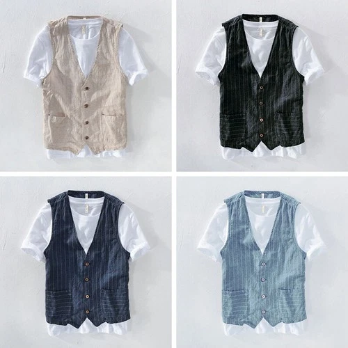 Mens Linen Look Stripe Vest Jacket Pocket Gilet Top Waistcoat Business Coat