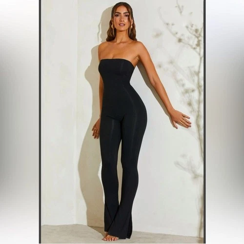Oh Polly Jamila Strapless Flared Split Hem Jumpsuit in Black XS 2 US 6 UK