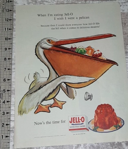 1954 JELL-O Vintage Print Ad Gelatin Desserts Pelican Fruit Flavors Delicious