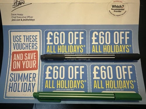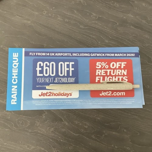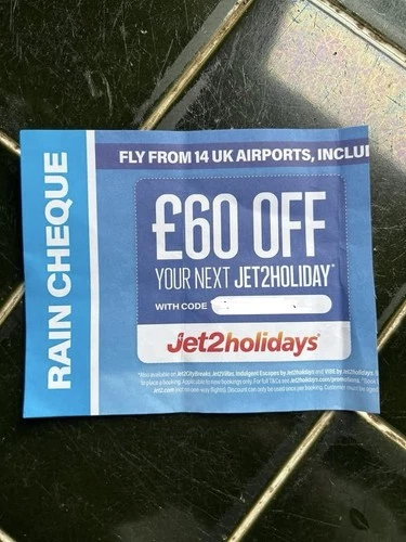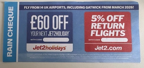 10x Jet2 Holiday Rain Cheque Discount Voucher £60 Off Holidays Book By 31 Mar 26