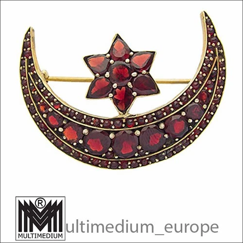 Antique Bohemian Garnet Brooch Moon & Star Art Nouveau Tombak Garnet Brooch