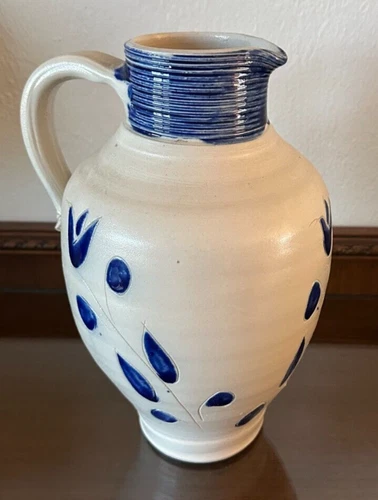 Unmarked Stoneware Salt Glaze Blue Floral & Striped 10.5" Pitcher Jug Pottery