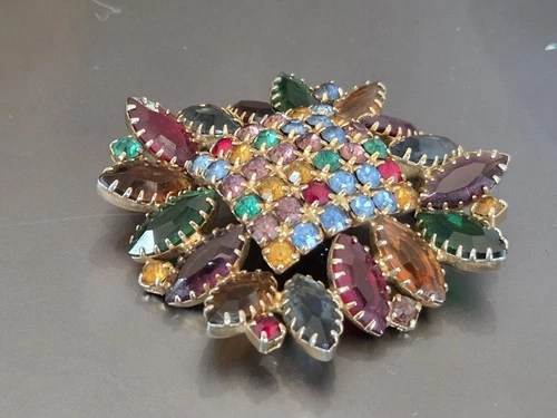 Unsigned Juliana D&E Gold Tone Multicolor Glass Rhinestone Floral Brooch