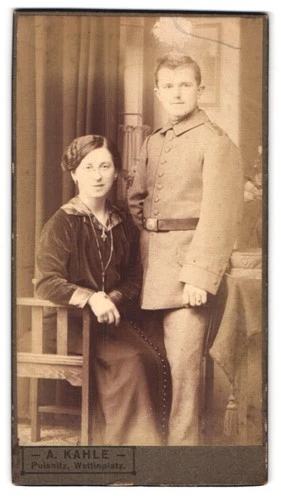 Photograph A. Kahle, Pulsnitz, Wettinplatz, soldier in uniform with wife