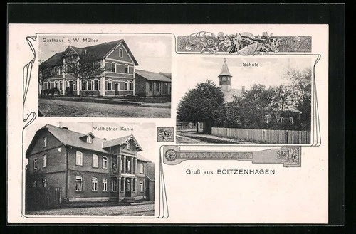 Boitzenhagen, Postcard, Guest House W. Müller, Vollhöfner Kahle, School 1910