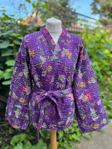 Indian Purple Paradise Kantha Cotton Short Kimono Robe Sleepwear Night Kimono US