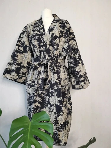 Indian Black Floral Cotton Kimono Sleepwear Kantha Quilt Night Suit Kimono Robes
