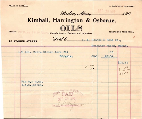1908 Kimball Harrington Osborne Mfr Dealer Importer OILS Billhead BOSTON MA