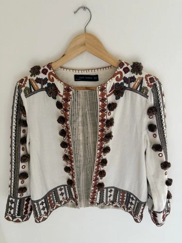 ZARA Woman Ivory Boho Aztec Embroidered Pom Pom Jacket XS