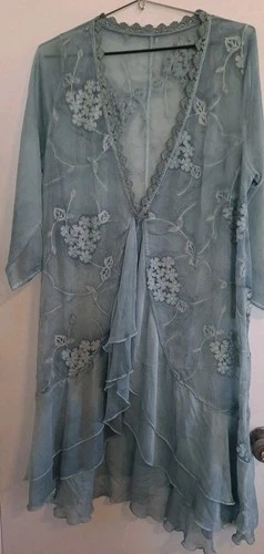 Sheer Teal Embroidered Lace Kimono Cover-up Silk Blend Size Large Cottagecore