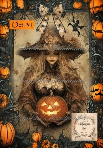 Halloween Witch With Pumpkin Designer Cotton Fabric Quilt Block Multi-size