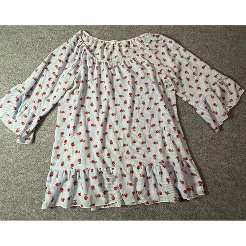 Free Kisses Plus Size 1X Floral Striped Peasant Blouse Ruffle Bell Sleeve