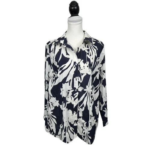Roaman's Blouse Plus Size 20W Blue & White Button-Down Collared Floral Work Top