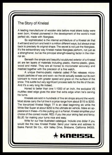 1970 Saska Parrott Ski Co. Brisbane California "The Story Of Kneissl" Print Ad