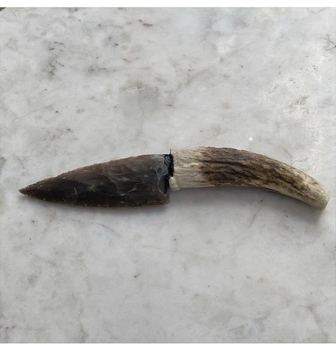 Handmade Chert Stone Knife w/ Deer Antler Handle Primitive Flint Knapped Blade