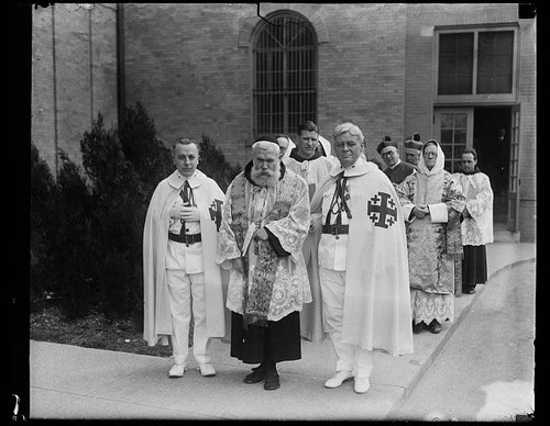 1928 Knights of Malta Costumed Group Church Courtyard Black Cross Capes