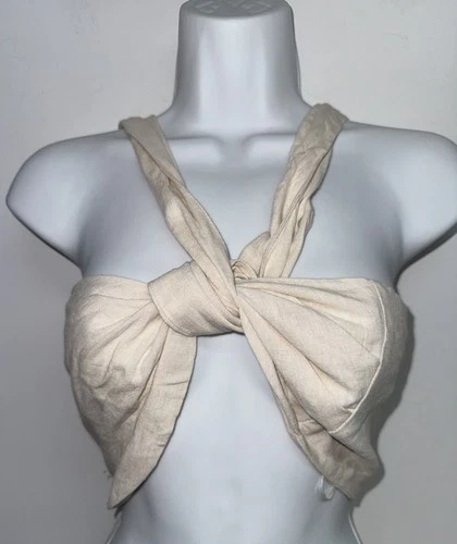 Zara Linen Blend Knotted Halter Crop Top Ecru Natural Neutral Boho Minimalist L