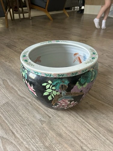 Vintage Chinese Hand Painted Flower Pot 12inch. Koi Pond Hummingbird Floral Pat