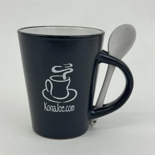 Black Ceramic Kona Joe .Com Coffee Mug With Spoon