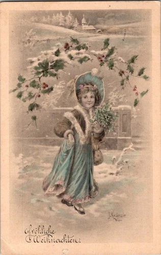 1908 J. Kränzle Christmas Postcard Girl w/ Mistletoe & Holly Vienna Art