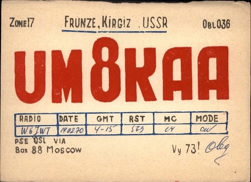QSL radio card UM8KAA 1970 Frunze Kirgiz Kyrgystan USSR Oleg Large Letters