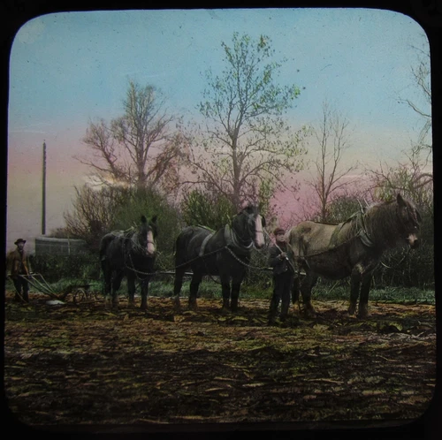 Glass Magic Lantern Slide BOY & MAN PLOUGHING FIELD WITH HORSES C1890 PHOTO