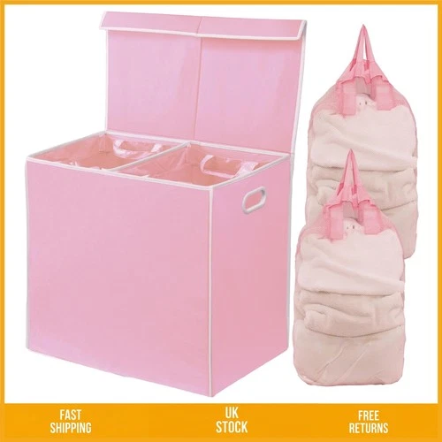 Elegant Double Laundry Hamper with Lid & Removable Bags Pink 23Lx13Wx22.75H