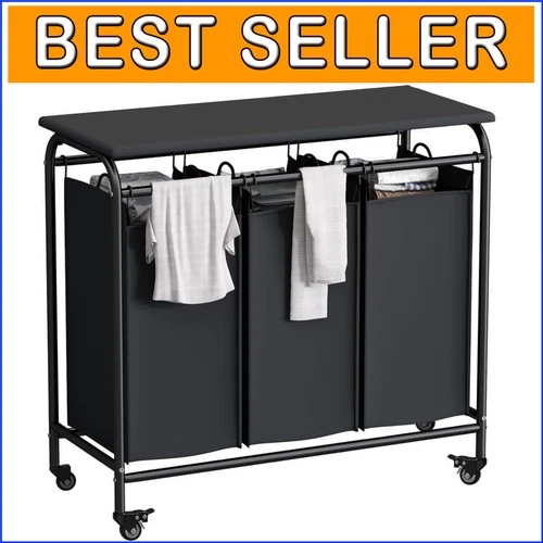 Heavy-Duty 3-Bag Laundry Sorter Cart with Ironing Board & Lockable Wheels—Black-