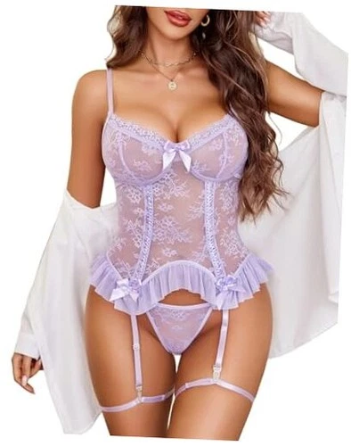 Sexy Lingerie for Women Lace Corset and Panty Outfits Sets Push Up Large Lilac