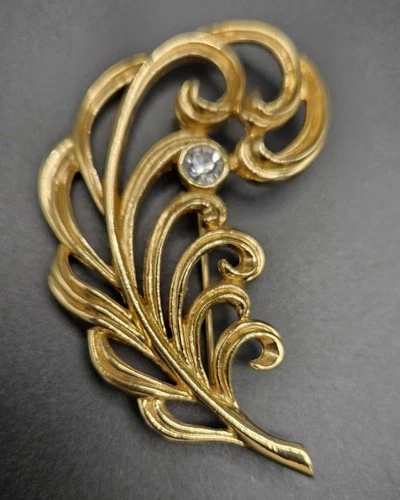 Gold Tone Leaf Pin Brooch - Clear Rhinestone- Swirls - Unmarked 2"