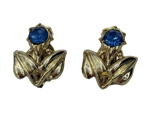 Vintage Gold Tone Blue Rhinestone Flower & Leaf Clip-On Earrings Retro Jewelry