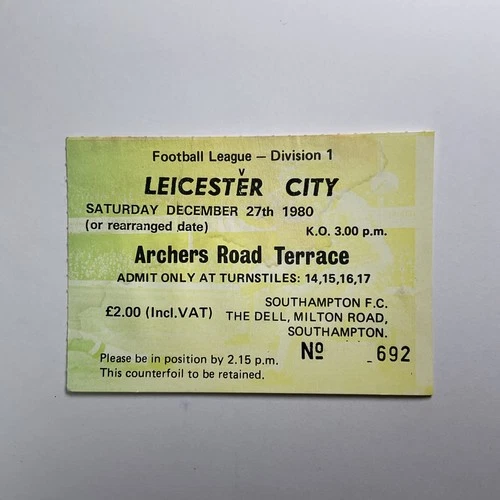Southampton v Leicester City Match Ticket; 27th December 1980