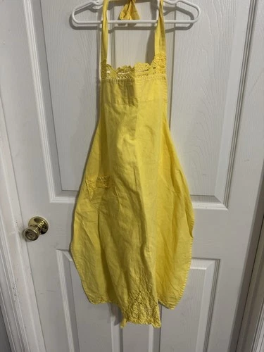 Vintage 1985 Women’s Paper White Linen-Cotton Embroidery, Lace Bib Yellow Apron