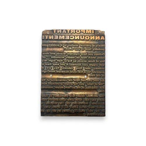 Vintage Letterpress Printing Block – Mosler Insulated File Ad Typography Metal