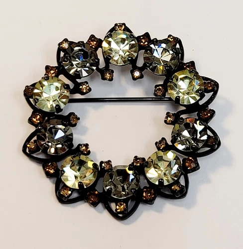 Joseph Warner Wreath Brooch Vintage Light Topaz Rhinestones Japanned Back Signed