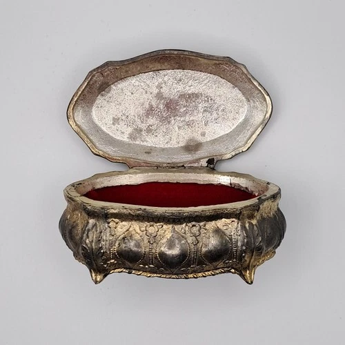 Vintage Ornate Silver-Tone Trinket Box Pastoral Scene Horse & Cart - Red Lining