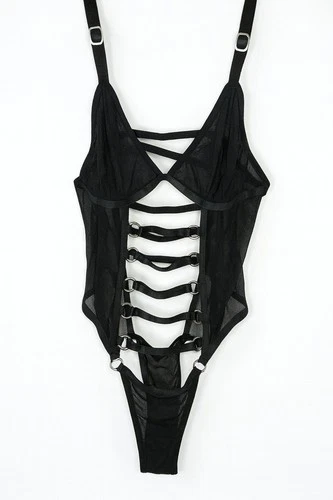 Strappy Black Mesh Harness Bodysuit Small Sheer Cutout Rave Clubwear Lingerie