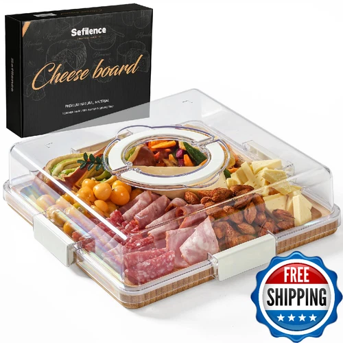 Charcuterie Board with Clear Locking Lid and Handle, Single Compartment Bamboo C