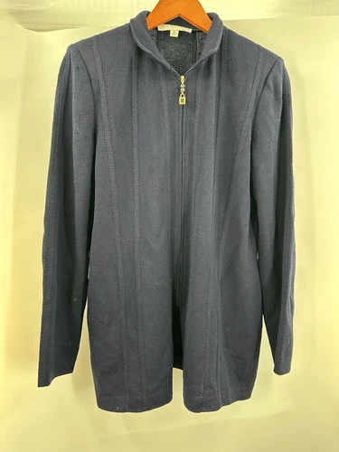 ST. JOHN Collection Navy Zip Front Knit Cardigan Sweater Sz 6 Long *Flaw* Q6