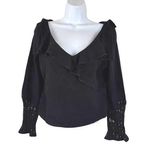 St. John Evening Santana Knit Top Size 2 Black Ruffle Long Sleeve V-Neck TP-3826