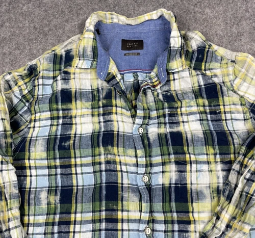 Jachs New York Shirt Mens Large Blue Green Yellow Plaid Linen Coastal Beach