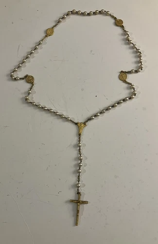 Vintage Unique Rosary Beads White Pearl Like Beads Gold Tone Cross Marked Italy