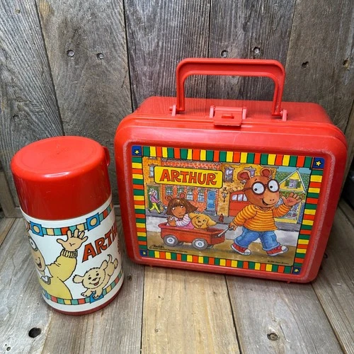 Vintage 1996 Arthur Aladdin Red Plastic Lunch Box w/ Thermos PBS Kid Small Crack